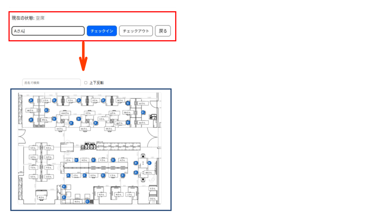 各自が出社時に座った席を選択 ➡ 名前入力 ➡ チェックインで登録。